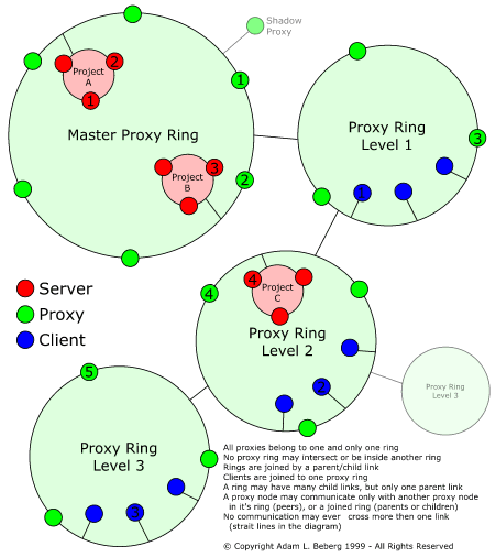 All nodes should be able to communicate the information they need to at any time. The design is highly redundant at all levels so that if a node fails, no other node should be affected. Proxies and servers act in rings, where any node in the ring can serve the same functions as any other.